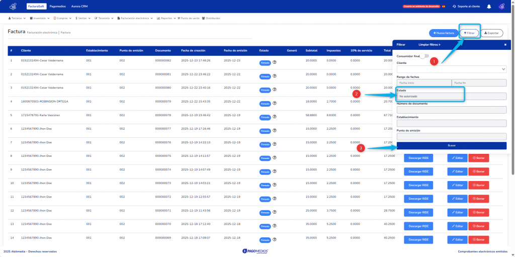 - Aplica los filtros necesarios (número de documento, cliente, rango de fechas, etc.) para localizar el comprobante específico que deseas duplicar.