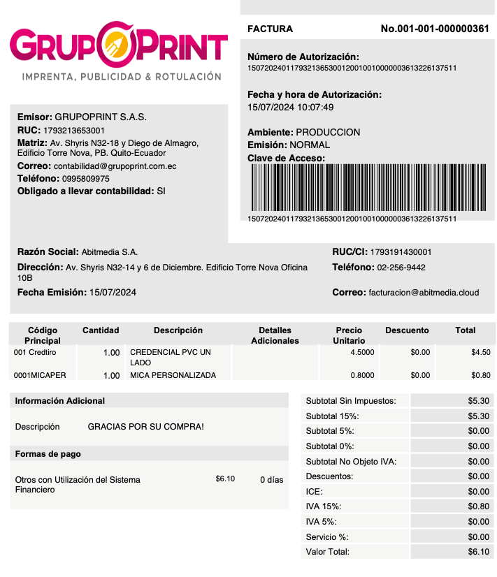 Ejemplo: Un supermercado emite un comprobante electrónico por una compra realizada en su tienda en línea.