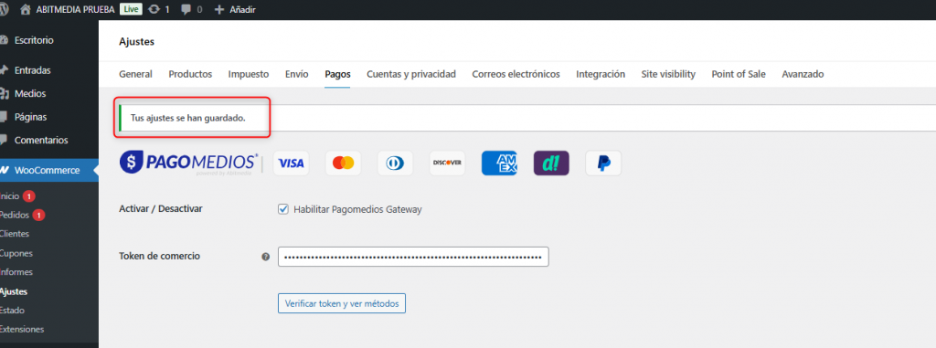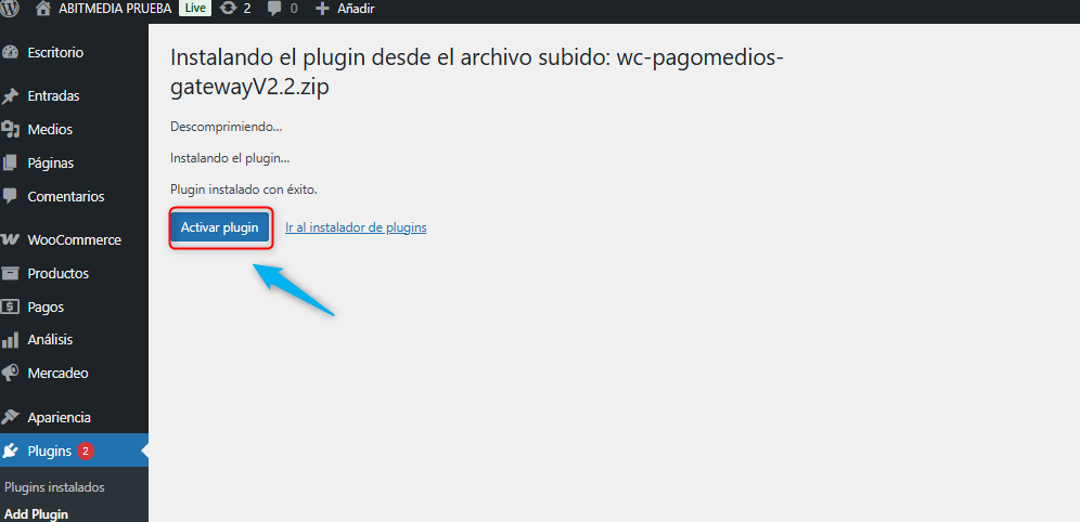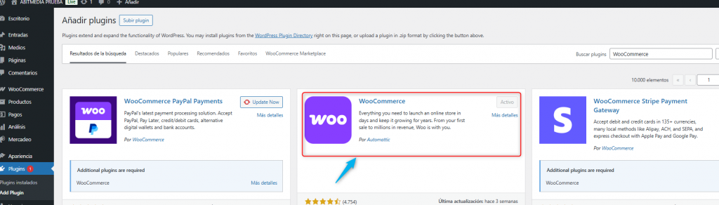 Es indispensable contar con el plugin de WooCommerce instalado. Una vez que este se encuentre activo en el sitio, podrá proceder con la instalación del plugin de Pagomedios.