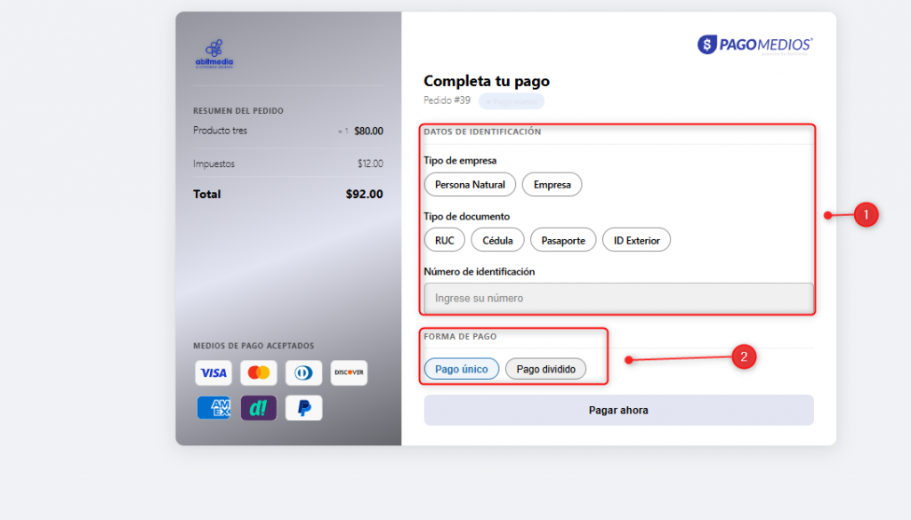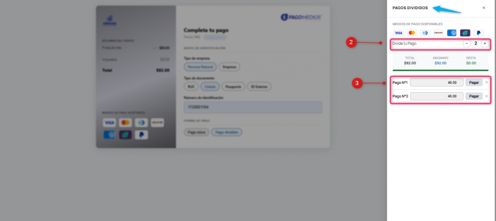 En la sección “Divide tu pago”, el cliente podrá aumentar o disminuir la cantidad de pagos que desea realizar (hasta un máximo de 3). El sistema calculará automáticamente el valor correspondiente a cada pago.
