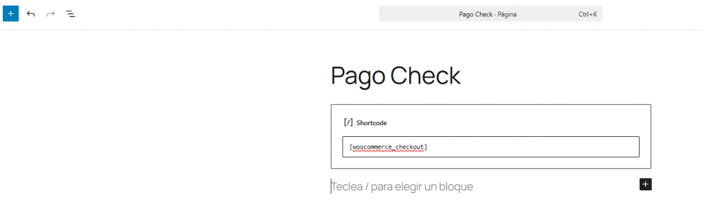 - Dentro del bloque, ingrese exactamente el siguiente código: [woocommerce_checkout]