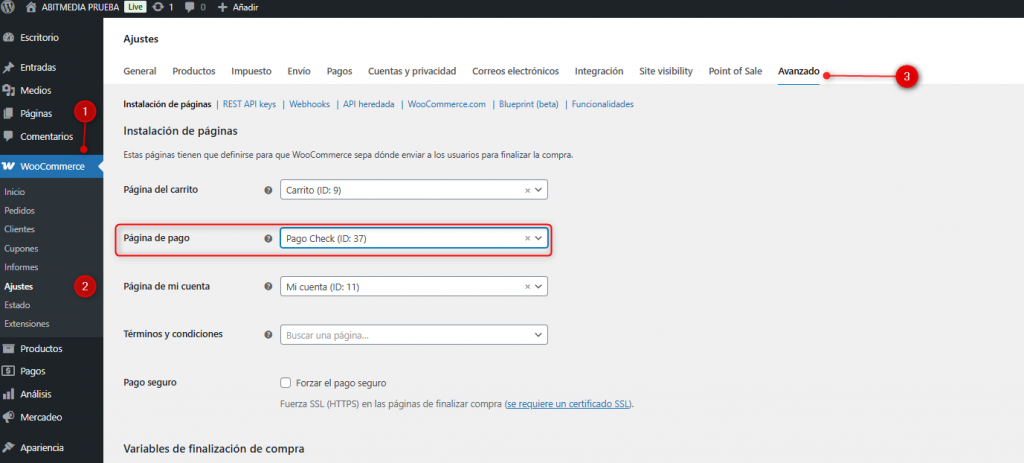 Una vez realizado lo anterior, se debe configurar en WooCommerce y acceder a la sección “Ajustes” y luego seleccionar la pestaña de “Avanzados”.