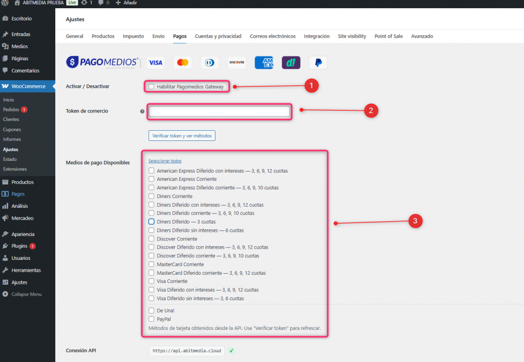 - Activar/ Desactivar: Habilitar Pagomedios Gateway Se debe habilitar esta opción para poder utilizar el plugin