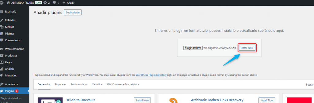 Haga clic en “Elegir archivo”, seleccione el plugin de Pagomedios previamente descargado y, finalmente, de clic en la opción “Install Now” para completar la instalación.