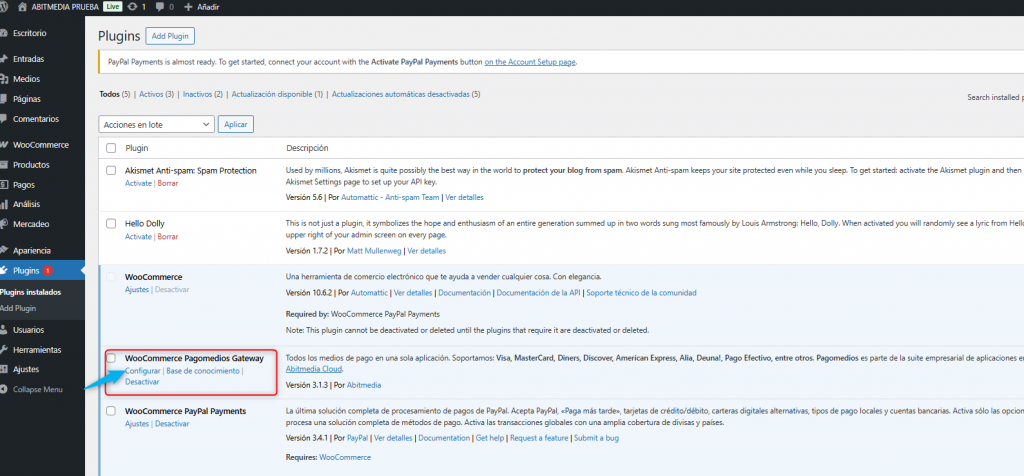 Una vez activado, será redirigido a la pantalla de plugins instalados. Allí podrá visualizar el plugin WooCommerce Pagomedios Gateway; haga clic en “Configurar” para continuar con la configuración.