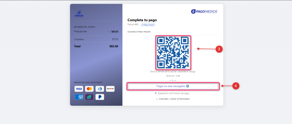- Se abrirá una nueva ventana donde el cliente podrá escanear un código QR para realizar el pago desde su celular u otro dispositivo.