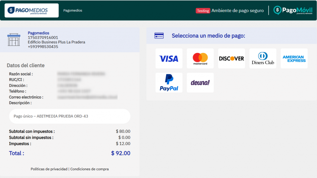 - Una vez realizado este paso, el usuario será redirigido al entorno de pago para finalizar la transacción.