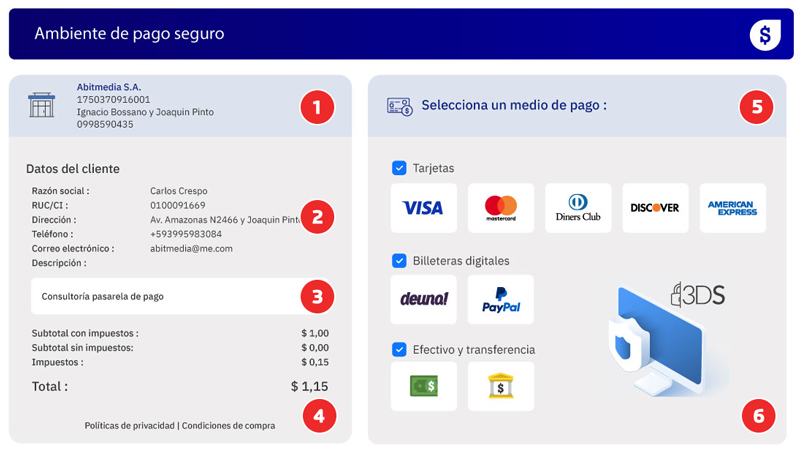 A continuación, se detallan las principales secciones del ambiente de pago estándar, con sus respectivas funciones y características.